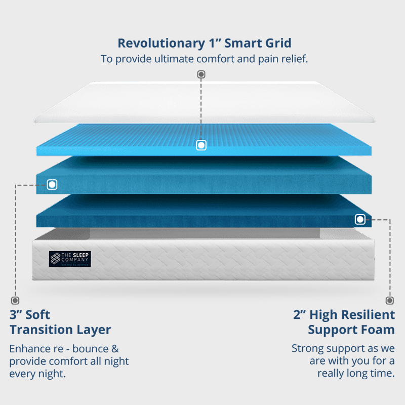 The flawless amalgamation of SmartGRID Ortho technology, along with the plush comfort is what every inch of our SMART Ortho mattress provides you with. This SMart GRID mattress is crafted with multiple layers of ingenuity; where each layer is scientifically designed ti to provide firm support for back and knitted with super-soft fabric for the ultimate comfort, even during ypur long and lazy weekenf slumbers. Revolutionary Japanese SmartGRID Ortho Technology which gives you absolute pain relief, excellent spine care while intelligently adapting to your body’s shape for optimum comfort. Additionally, this dual layer mattress is also designed to relieve body pain by supporting and aligning your spine at the right points, irrespective of how you sleep. Available in 5/6 inches. 4” High Resilient support foam: Strong support which will last you for upto 10 years against sinking and collapsing with a firmness score of 7. Soft cotton cover; Japanese Grid with 2500 air channels to promote free air circulation throughout the night for sweat-free sleeping even during high humidity and hot summers. It is also non-toxic and hypoallergenic. Ergonomically designed orthopedic mattress, with slight firmness for extra back support. This dual layer mattress is intelligently designed to relieve body pain by supporting and aligning your spine at the right points, irrespective of how you sleep. Advanced Motion Isolation technology cancels out any kind of disturbance caused by the person sleeping next to you. Only the smartest sleep technology to ever be invented! Patented Japanese SmartGRID Technology that beats any other mattress type in the industry boasting features like posture support, motion isolation and more that you cannot compare with any other mattress out there! Nishi Cochin Great Mattress bhavi wadhawan Amazing Product!!!!! I bought this mattress recently and I must say that it feels amazing! It feels super comfortable and I’ve been sleeping like a baby now. Worth the money for sure. Must buy! Preshit Gupta I have been on bedrest for last 3 months due to a severe knee injury. My old mattress was awful for sleeping – The Sleep Company mattress has given me great comfort for my hips and shoulders. I have had it about 1 week and I feel that my sleep has improved greatly. Ayush raj Way way better than my old mattress .. I feel so good that finally I bought the sleep company mattress .. wish we had this earlier and could get this sleep long back.. must try . Hina Shaikh amazing product .. using for 5 months and my son , husband loves .. Gajendra Thakur Have been using for 9 month best product aver we both love sleeping now. Mamta c Best experience and as promised by the sleep company it’s really giving us a great sleep. They are always ready to answer your queries. Very good service. Rajesh Chauhan Delhi Feel Much Better On Body Pains We were very excited and were waiting for our mattress to come – it came in a very cute blue bag. We were super excited to open and unroll it – I still remember it opening and looking beautiful in the white and grey cover – very soft. In the beginning it felt different and in few days my body pains started to reduce. I was sleeping much better – I hope it keeps its promise and we continue to love it Sejal Kumar Kolkata I Am Very Satisfied With My Purchase I am very satisfied with my purchase, reviewing this after using sleep company’s mattress almost more than 3-4 months. The mattress is very comfortable & provides a good night sleep. Yathin Patil Works great! This is really comfortable and well worth the price. Great value for money on the whole. Nandani Kumari Best sleep of my life – the mattress will change the way you sleep. Must recommend to give the grid technology a try. there is nothing to lose – one can return in 100 Nights if they do not like. Amaze78 Superb Technology. No Comparison With Other Material. Quality Sleep, Pain Relief and Comfort. Chinmay Panda Review About Sleep Smartgrid “This sleep smartgrid is awesome Satanil Pal Mumbai Love It After 3 Weeks Of Use Sudeshna Utility Of The Item Is Supposed To Remain Same In Future As Well. Comfortable and useful for sleep.So far no pain related problem encountered. savan kothadiya Good so far Overall satisfied with product. Lokesh Dhawan Best Buy Extreme comfortable. It has relieved me of back pain. Very soft, I find it difficult to sit without back sopport (alti-Palli) way. swastik poojari I was initially not keen to buy a mattress online without trying. However given the company promised 100 Nights, I decided to try it. I would say it was a good decision and we have been sleeping nicely on our new mattress We love our mattress and are so happy we bought the sleep company. Enjoying great sleep and no back aches!!! Dinesh Chandigarh Perfect Bed I was using memory foam mattress but started having back pain a couple of months back so decided to change my mattress according to the doctor. I have ordered sleep company mattress suggested by my dear friend and the experience was amazing. After started using this mattress my back reduced a lot and having a really good sleep. I and my family loving our new smart grid mattress. Ritesh Jain Vadodara Mattress Is Awesome Sound sleep on the smart grid mattress is for sure. Beyond the product, their service is also good, including customer care, shipping, after-sales service.